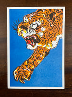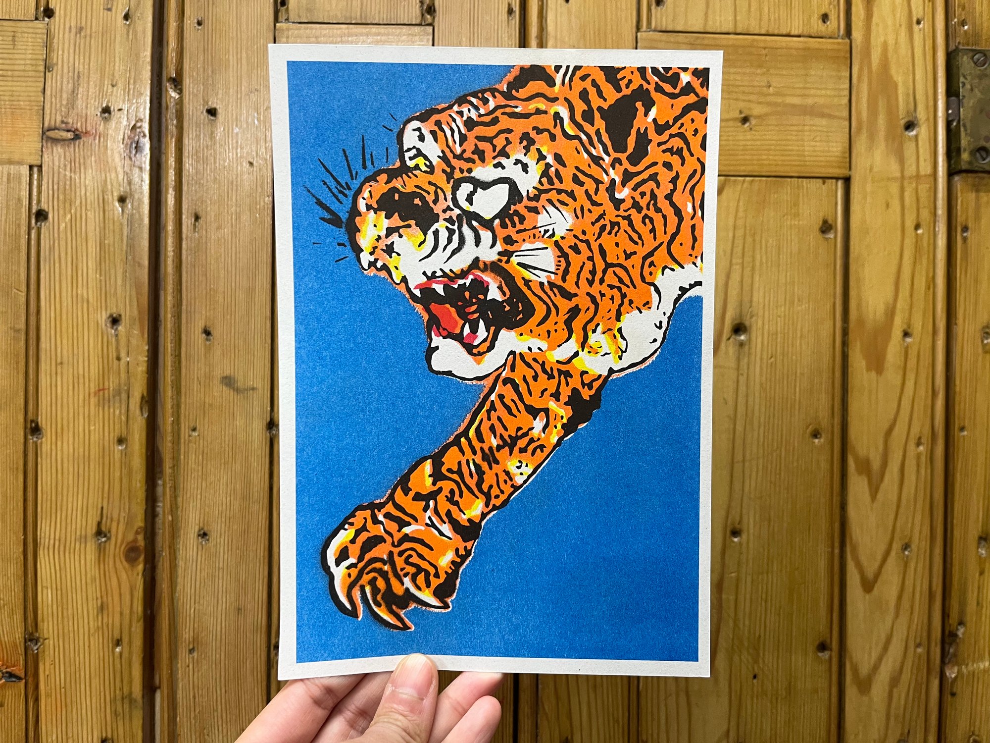 Original ukiyo-e prints are the trio with two tigers and dragon which is the imaginary fight between the two auspicious animals representing the sky (dragon) and the earth (tiger). Whenever the dark clouds appear and the strong wind blows, the legend says the two are fighting (none of them wins, however). The publisher indicated that their skillful artists took 18 months of engraving and 3 months of printing to make this dynamic masterpiece back to the modern time.