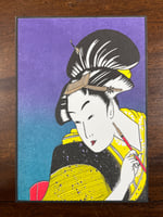 This young woman is probably the mistress of one of the tea-houses of the gay quarters at Shin Yoshiwara. Her black hair is neatly tied up in an omarumage style, her teeth are dyed black (indicating that she is a married woman), but her eyebrows are unshaved. There is an air of cool gracefulness in her expression and pose, and one can imagine that she feels that her love will never be discovered.