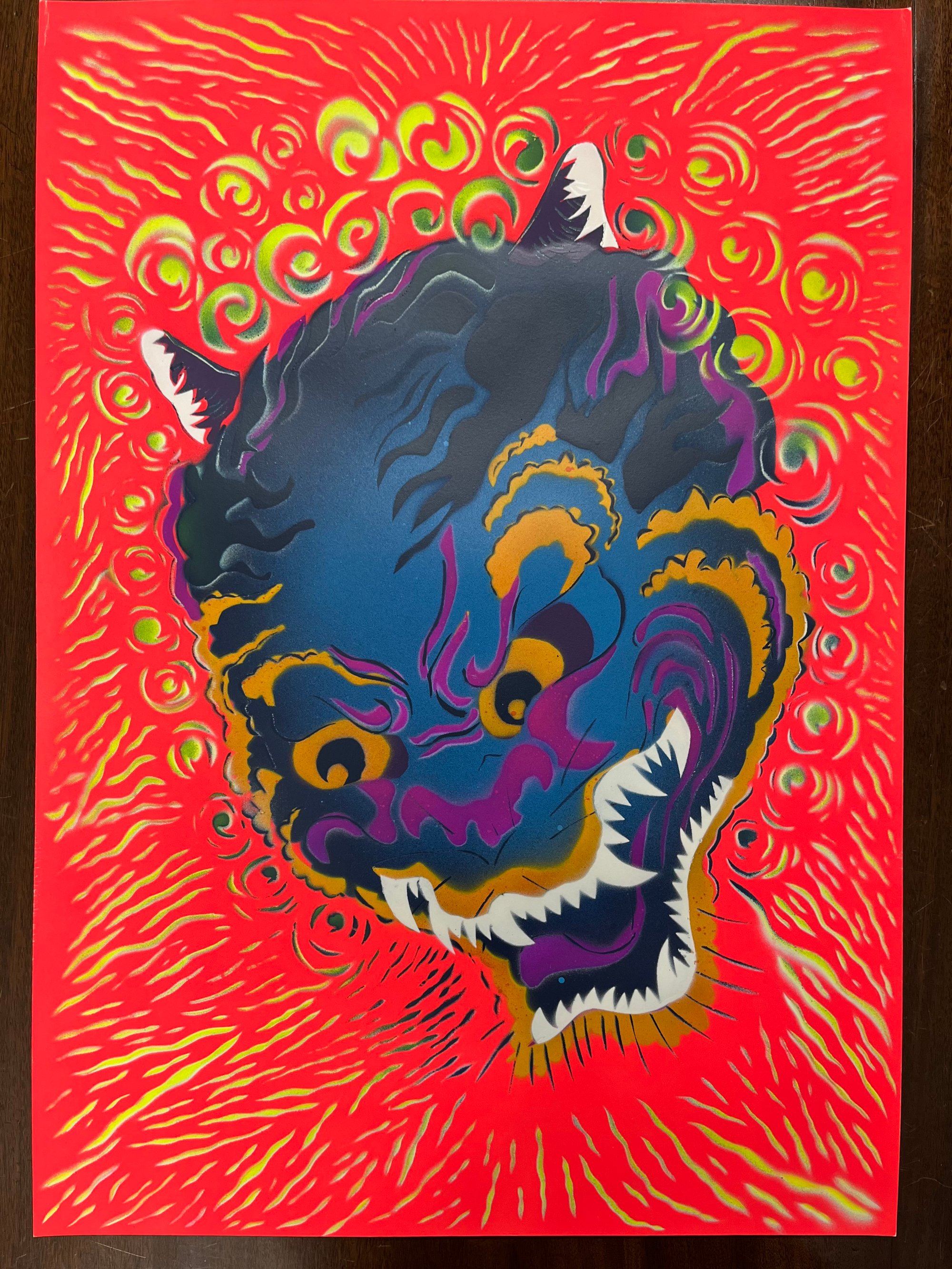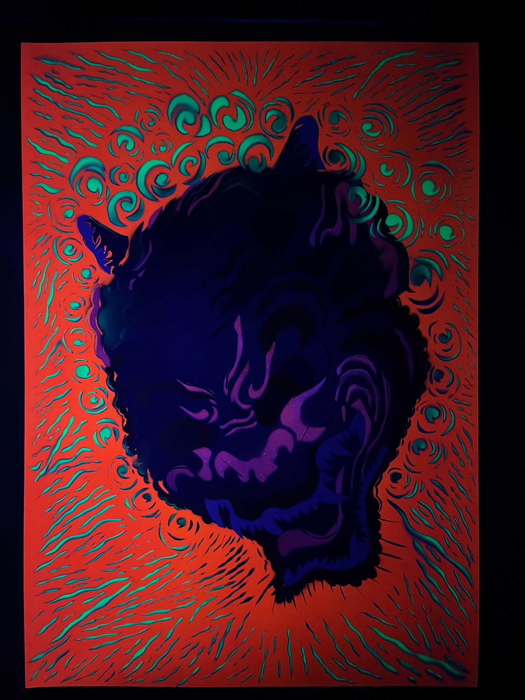Japanese folklore often describes ONI as a fearsome creature with great strength and large size. UV light brightens up this print, and I absolutely love it!