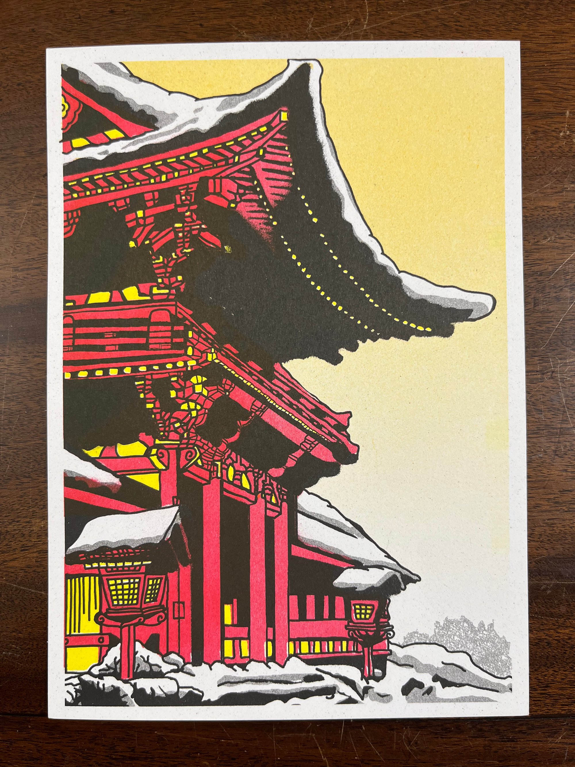This is one of the most famous woodblock prints by Takeji Asano. It features an imposing temple gate, the beauty of the red gate enhanced with a cover and surroundings of white snow defying the winter cold to visit.