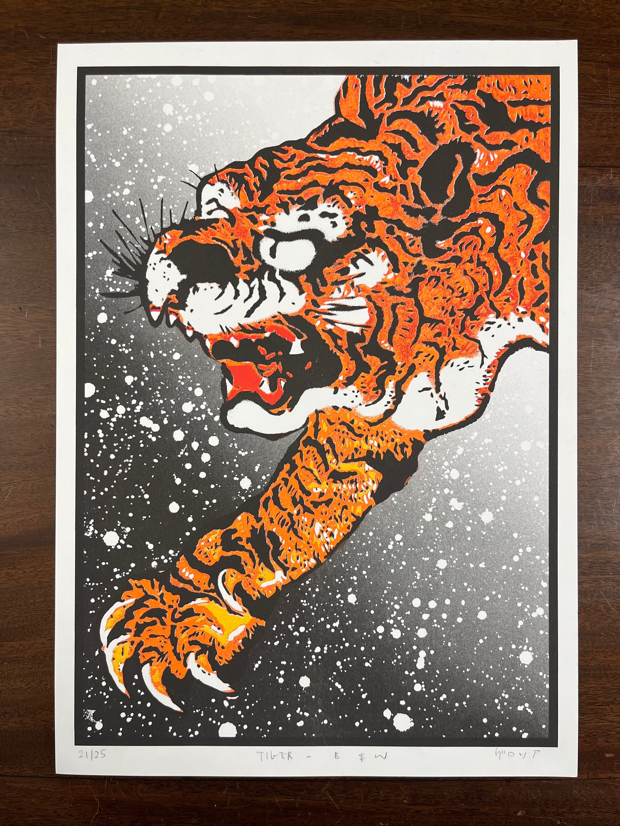 Original ukiyo-e prints are the trio with two tigers and dragon which is the imaginary fight between the two auspicious animals representing the sky (dragon) and the earth (tiger). Whenever the dark clouds appear and the strong wind blows, the legend says the two are fighting (none of them wins, however). The publisher indicated that their skillful artists took 18 months of engraving and 3 months of printing to make this dynamic masterpiece back to the modern time.